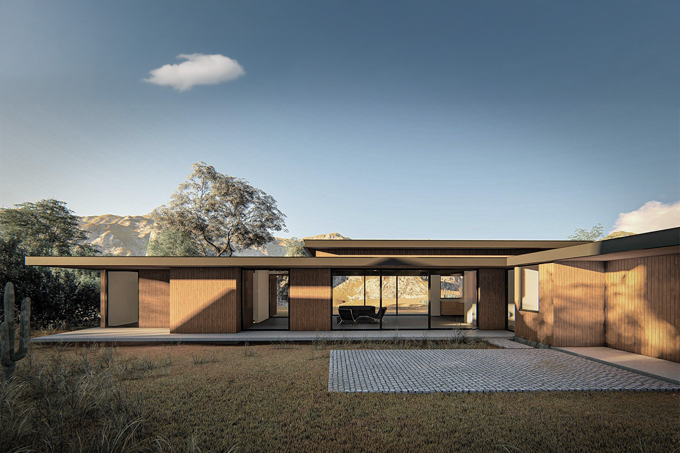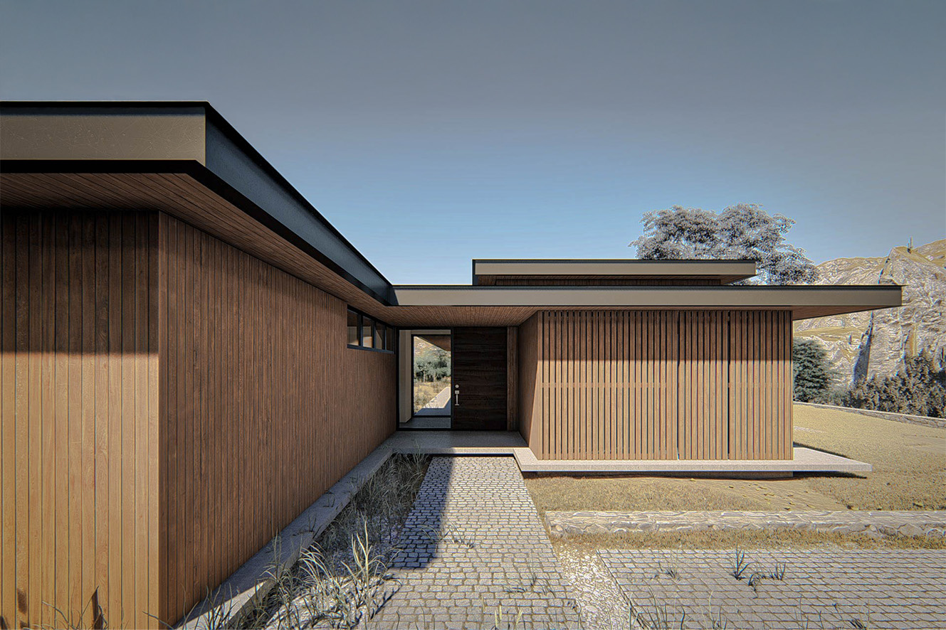 La casa se posa en una plataforma de hormigón que se levanta levemente sobre el terreno, y a partir de una serie de grandes paños vidriados y muros perimetrales, genera una volumetría simple y muy tarnsparente. En el estar y cocina se levanta una cubierta más alta que le da doble altura.